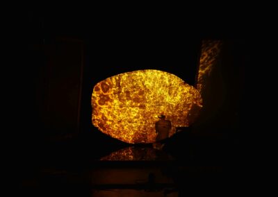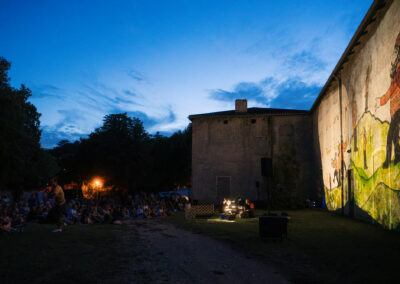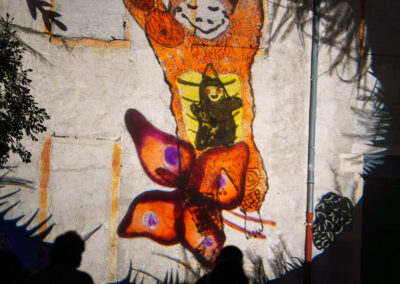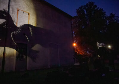 Ces êtres de la métamorphose nous guident, s’organisent en rondes ou en procession à nos côtés. Ils nous interrogent sur notre relation au vivant et à la nature, autant à l’échelle intime que collective ou universelle. Ils viennent chuchoter à l’oreille des humains qu’ils sont là tout près, que leur monde invisible se mêle quotidiennement au nôtre. Cette mémoire ancienne cachée dans les fissures et sous la peau des murs fait surface à la première lueur ou au premier coup d’œil qui la révèle.