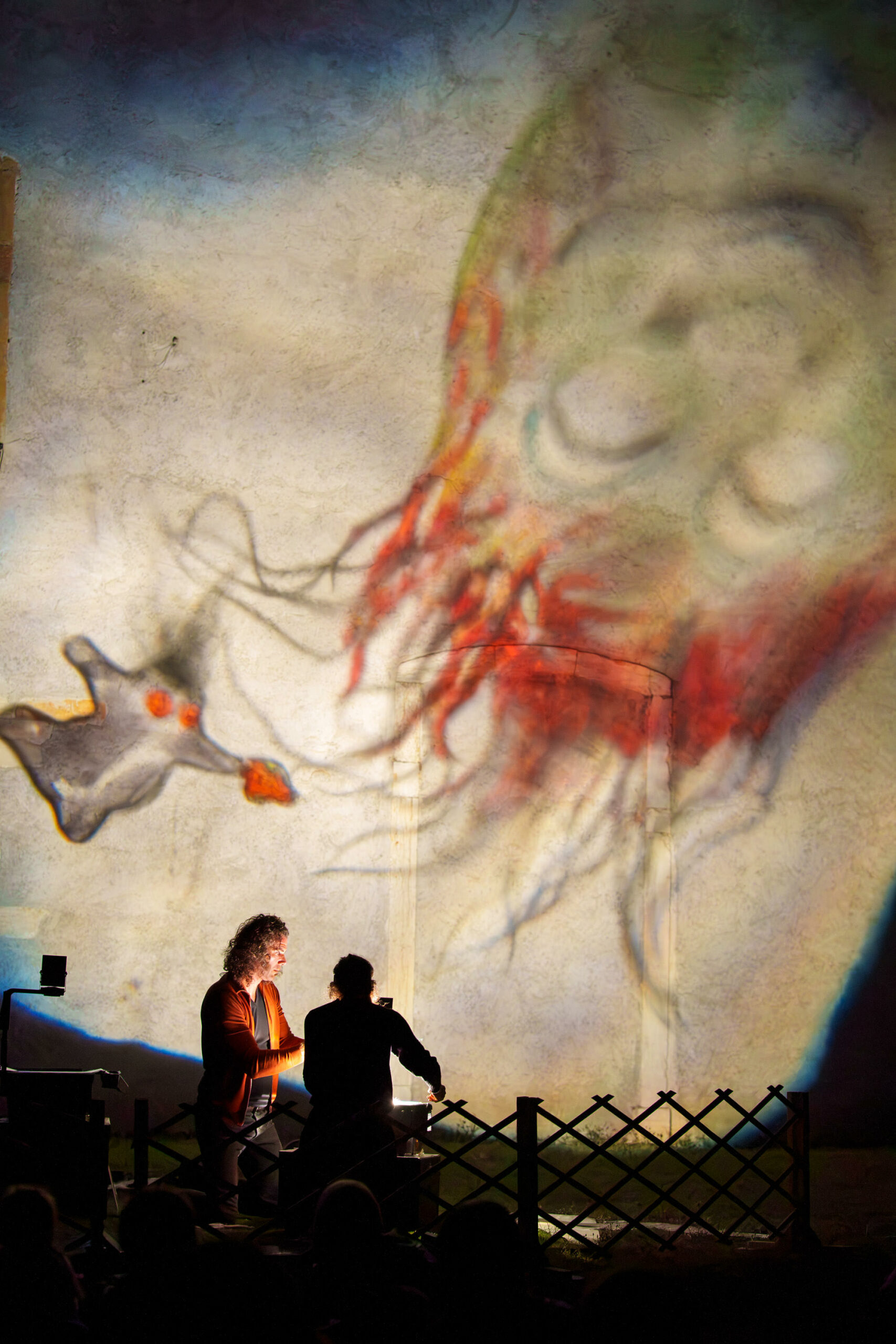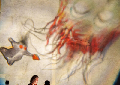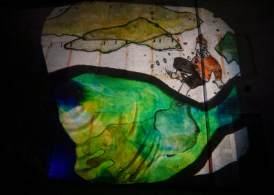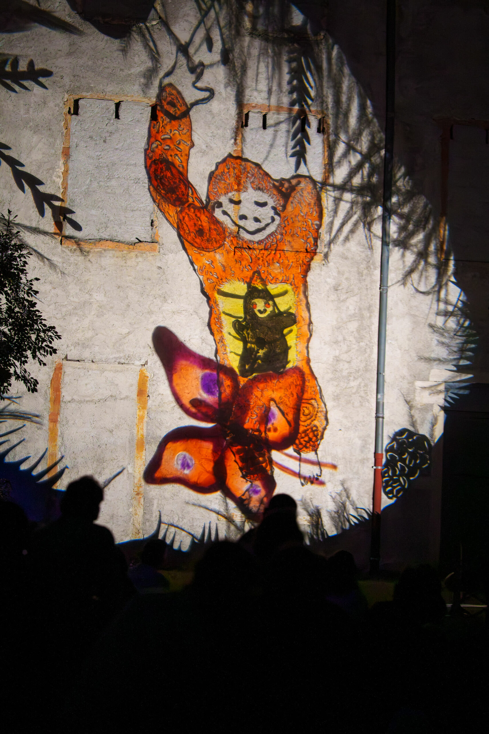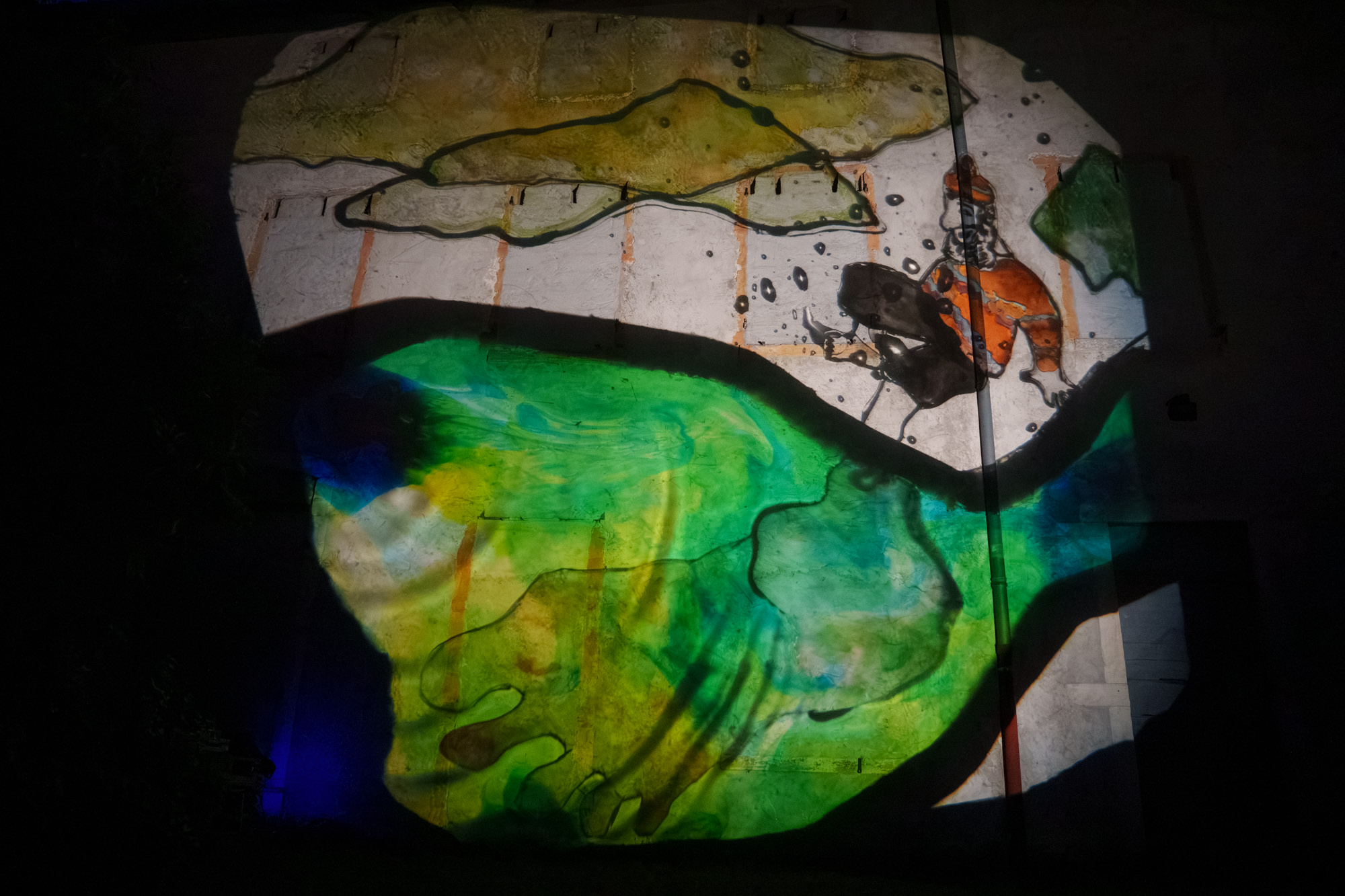Les trois marionnettistes par leur manipulation en direct sur 3 rétroprojecteurs placés au sol, donnent peu à peu corps à un bestiaire imaginaire. Cette performance, qui mêle projections grands formats et musique, peut se dérouler sur une place, des façades de maisons, des bâtisses, des parois