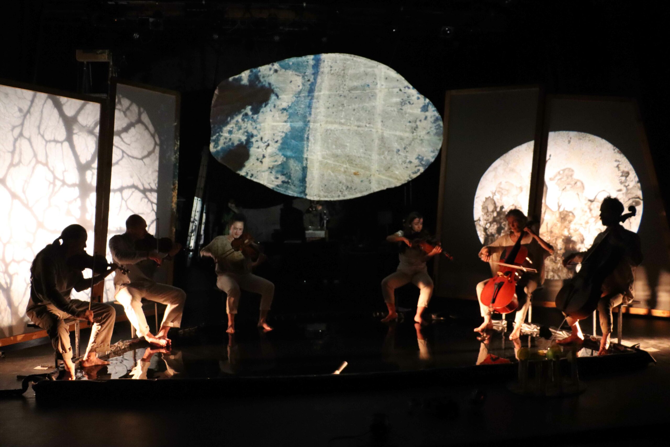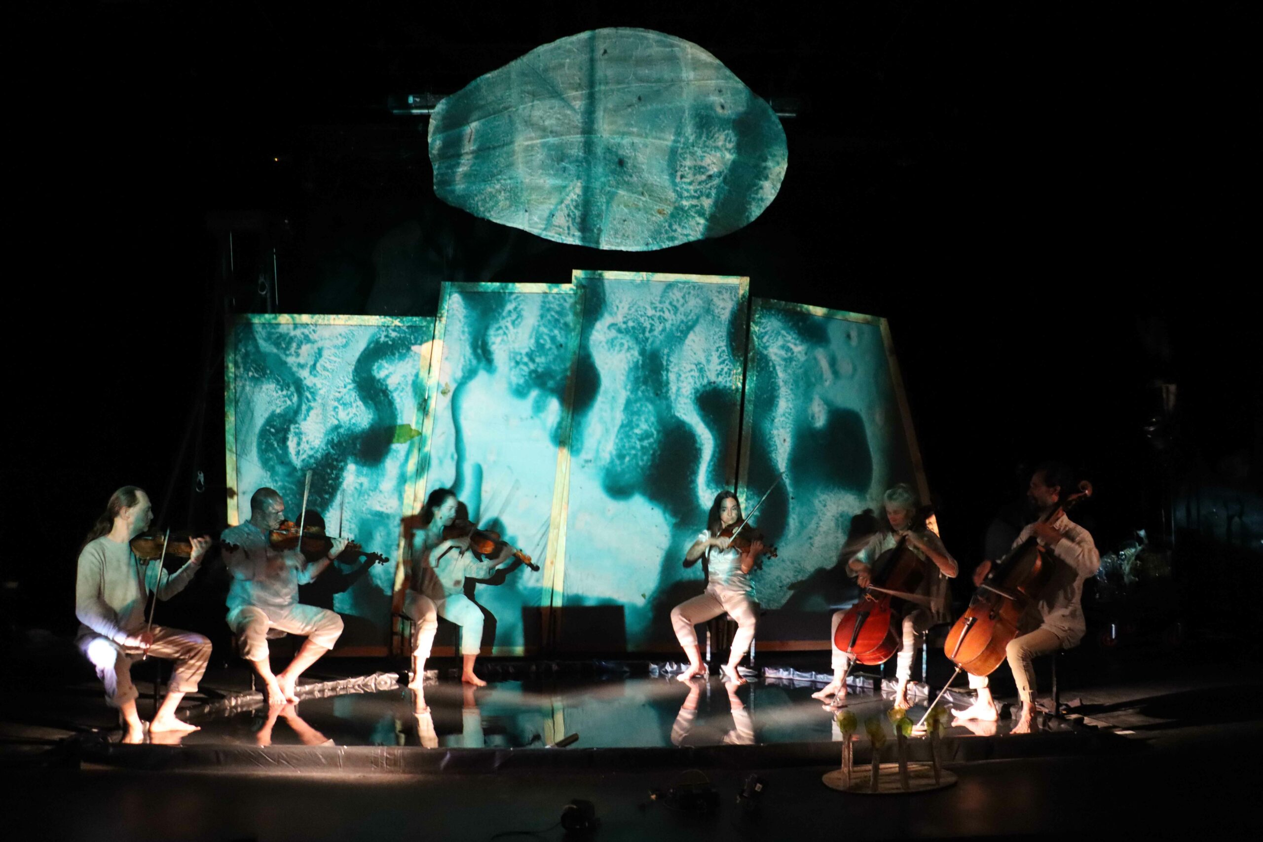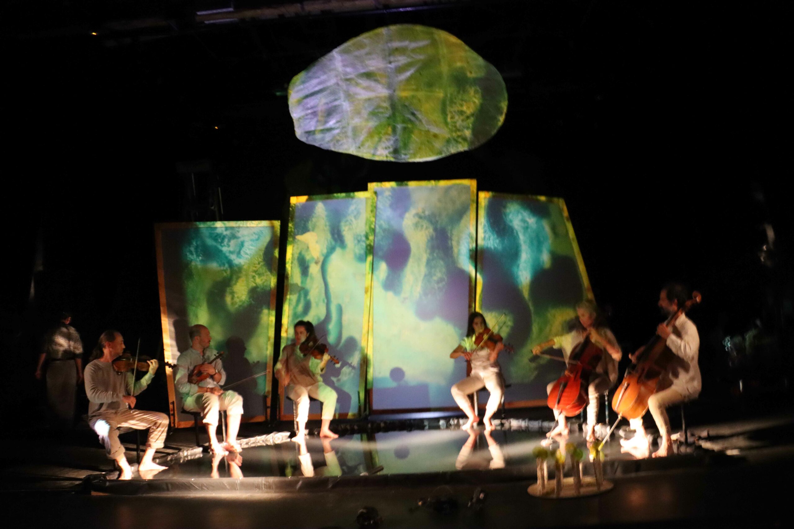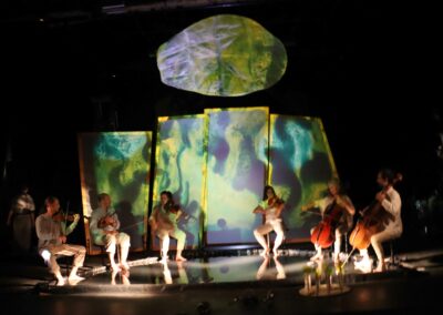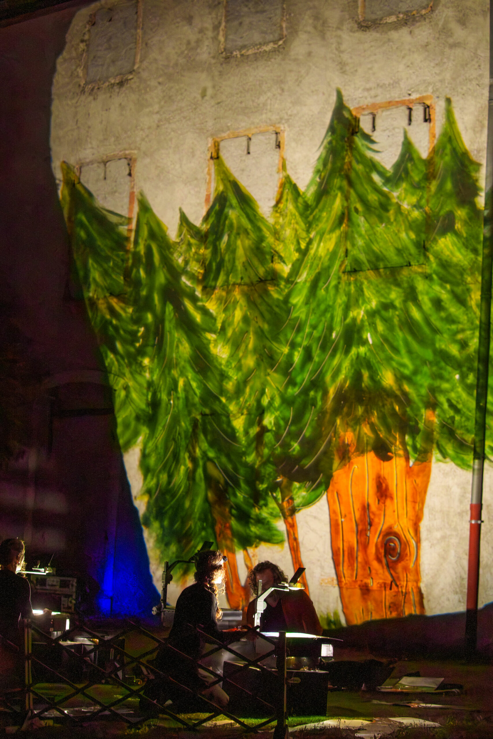 Les trois marionnettistes par leur manipulation en direct sur 3 rétroprojecteurs placés au sol, donnent peu à peu corps à un bestiaire imaginaire. Cette performance, qui mêle projections grands formats et musique, peut se dérouler sur une place, des façades de maisons, des bâtisses, des parois
